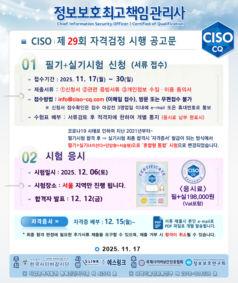 Á¤º¸º¸È£ÃÖ°íÃ¥ÀÓ°ü¸®»ç(CISO|CQ) Á¦ 29ȸ ÀڰݰËÁ¤ ½ÃÇè ½ÃÇà¾È³»