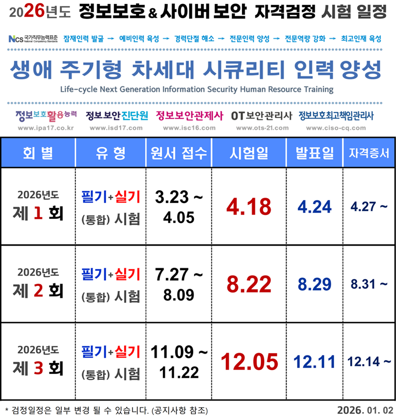 ¾È³çÇϼ¼¿ä. Á¤º¸º¸È£ ¹× Á¤º¸º¸¾È ÀڰݰËÁ¤ »ç¾÷´Ü »ç¹«±¹ÀÔ´Ï´Ù. "Á¤º¸º¸È£ÃÖ°íÃ¥ÀÓ°ü¸®»ç(CISO)" µî·Ï¹Î°£ÀÚ°Ý 2026³âµµ °ËÁ¤½ÃÇà °èȹÀ» ´ÙÀ½°ú °°ÀÌ °ø°íÇÕ´Ï´Ù. ⊡ °ËÁ¤½ÃÇà Á¾¸ñ : Á¤º¸º¸È£ÃÖ°íÃ¥ÀÓ°ü¸®»ç (´ÜÀϵî±Þ) * Á÷¾÷´É·Â°³¹ß¿ø ¹Î°£ÀÚ°ÝÁõ Á¦ 42516 È£ * °úÇбâ¼úÁ¤º¸Åë½ÅºÎ Á¦ 2018-004239 È£ ⊡ °ËÁ¤½ÃÇà ȸÂ÷ : 30ȸ~ [ 2026³âµµ ÀڰݰËÁ¤ ÀÏÁ¤ ¾È³» ] ![]() |