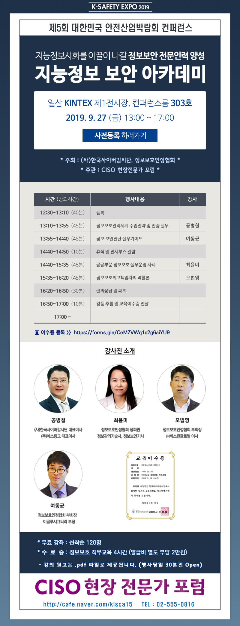 Á¦5ȸ ´ëÇѹα¹ ¾ÈÀü»ê¾÷¹Ú¶÷ȸ ÄÁÆÛ·±½º◦ ÁÖÃÖ : (»ç)Çѱ¹»çÀ̹ö°¨½Ã´Ü, Á¤º¸º¸È£ÀÎÁ¤Çùȸ◦ ÁÖ°ü : CISO ÇöÀåÀü¹®°¡ Æ÷·³◦ ÀϽà : 2019. 09. 27(±Ý) ¿ÀÈÄ 13½Ã~17½Ã◦ Àå¼Ò : KINTEX Á¦1Àü½ÃÀå 3Ãþ, 303È£ ȸÀǽÇ◦ ÁÖÁ¦ : Á¤º¸º¸È£ ´ã´çÀÚ ¹× CISO ´ë»ó Á÷¹« ¿ª·® ÄÁÆÛ·±½º ◦ »çÀüµî·Ïhttps://forms.gle/CeMZVWq1c2g6aiYU9