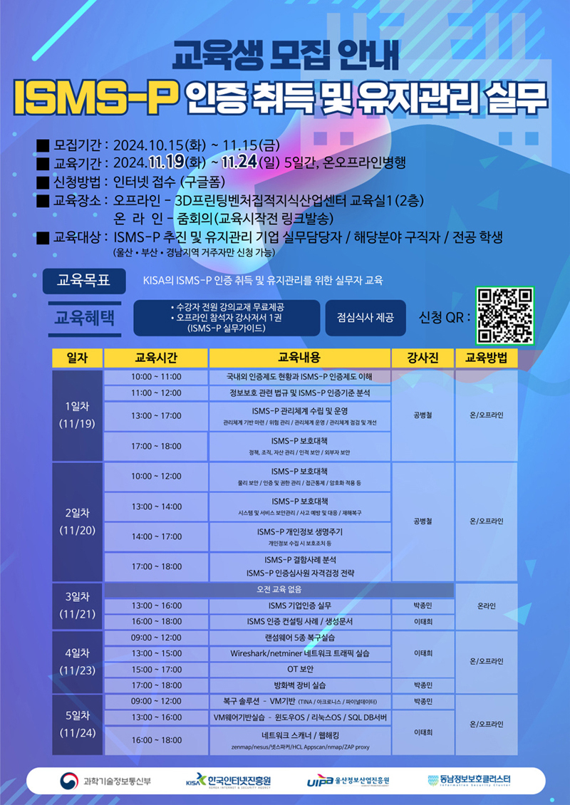 ![]() ISMS-P ÀÎÁõ Ãëµæ ¹× À¯Áö ½Ç¹« ¢º ÀϽà : 2024. 11. 19(È) ~ 24(ÀÏ) 35H/5ÀÏ ¢º Àå¼Ò : ¿ï»ê ³²±¸ Å×Å©³ë»ê¾÷·Î55¹ø±æ 79-10 (¿ï»êÁö½Ä»ê¾÷¼¾ÅÍ 2Ãþ) ¢º ´ë»ó : Á¶¼±/ÇØ¿î¾÷ü ¹× ¿¬°ü ±â¾÷ ÀÓÁ÷¿ø ¢º ºñ¿ë : ¹«·á (Á¡½É Á¦°ø) ¢º ¹«·á Á¦°ø : ±³Àç ¹× µµ¼ (ISO 23806, Á¤º¸º¸¾ÈÁø´Ü¿ø, OTº¸¾È°ü¸®»ç 3±Ç) ¢º ±³À°¹æ½Ä : ¿ÀÇÁ¶óÀÎ ¹× ¿Â¶óÀÎ º´Çà ¢º Á¢¼ö : https://m.site.naver.com/1vdry ![]() |