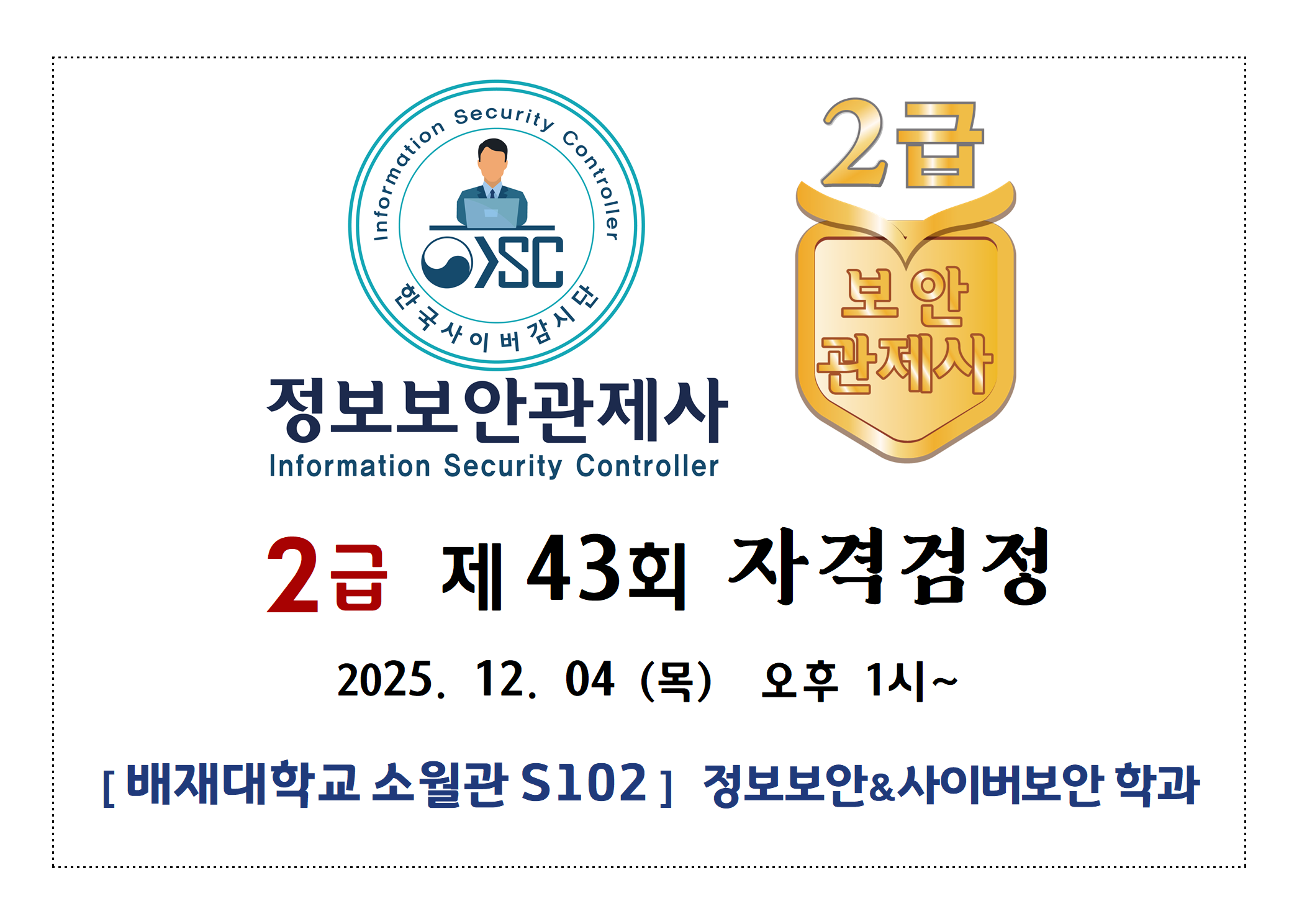 ![]() (»ç)Çѱ¹»çÀ̹ö°¨½Ã´Ü(°øº´Ã¶ ÀÌ»çÀå)Àº 12¿ù 04ÀÏ ¹èÀç´ëÇб³ »çÀ̹öº¸¾ÈÇаú ¹× Á¤º¸º¸¾ÈÇаú ÀçÇлýÀ» ´ë»óÀ¸·Î Á¤º¸º¸¾È°üÁ¦»ç ÀڰݰËÁ¤ 2±Þ ½ÃÇèÀ» ½ÃÇàÇÑ´Ù°í ¹àÇû´Ù.